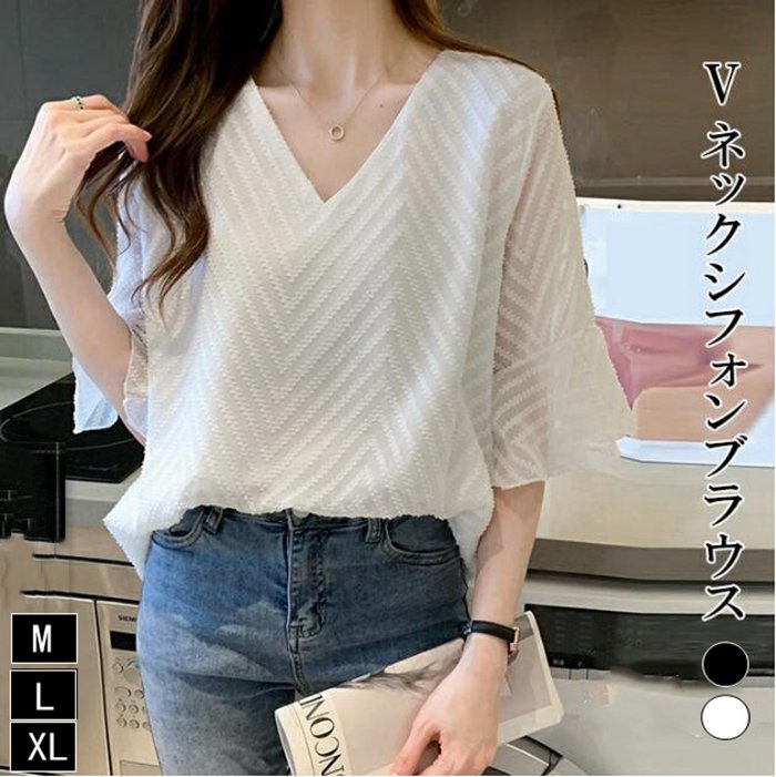 ブラウスレディースシフォンシースルーフレア袖Vネックトップス半袖7分袖切替透け大きいサイズ 夏ML2L