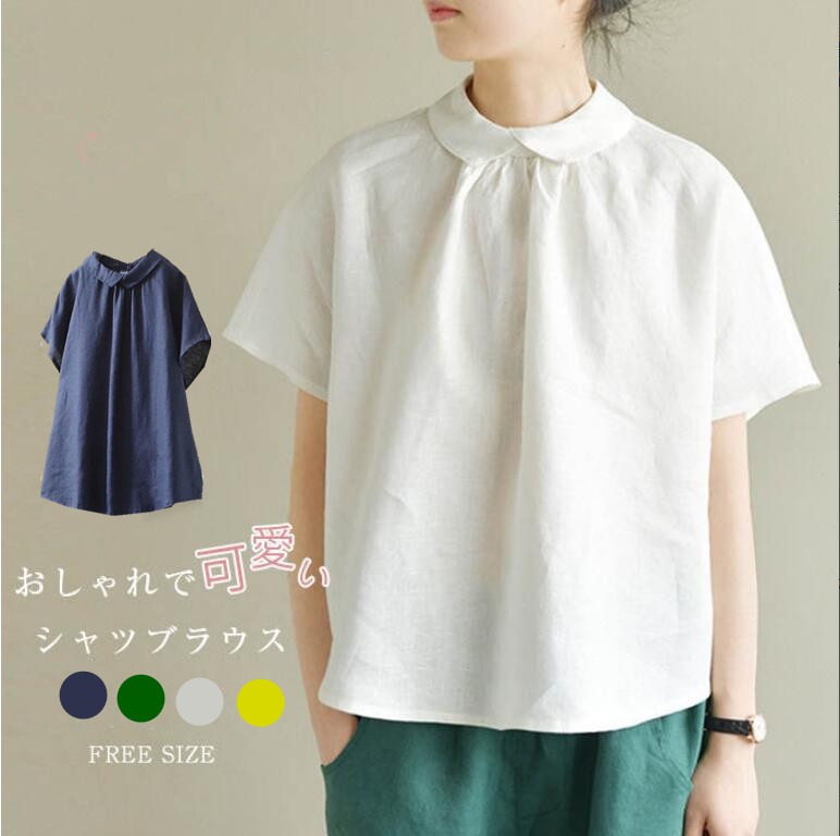 リネンブラウス レディース ブラウス 半袖 フレンチスリーブ トップス プルオーバー カジュアル シャツ