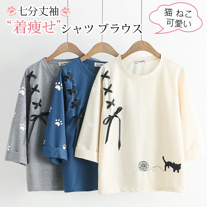 シャツ ブラウス レディース トップス 七分丈袖 猫 ねこ 可愛い 通勤 通学 着痩せ 涼しい 薄手 かわいい