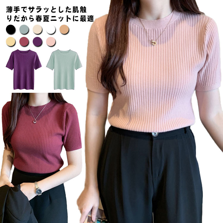 サマーニット レディース 半袖ニット オフィス ニット トップス カジュアル 五分袖 リブニレディースファッション トップス シャツ ブラウス