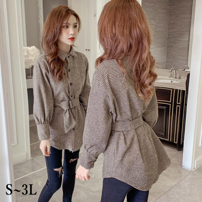 シャツ ブラウスベルト付きトップスレディース 長袖チェック千鳥柄大きめ ゆったり大きいサイズ小さいサイズ着痩せカジュアルシンプル春秋SML2L3L
