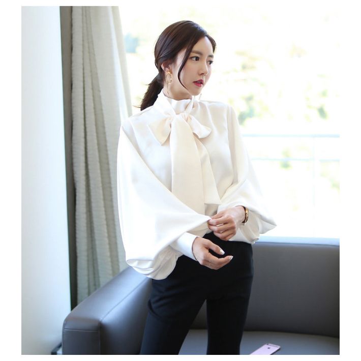 ボリューム袖 ボウタイ ブラウス 上品 パーティー フォーマル きれいめ 長袖 トップス レディース シャツ ゆったり オフィスカジュアル バルーンスリーブ バルーン袖 無地 リボン オフィス 結