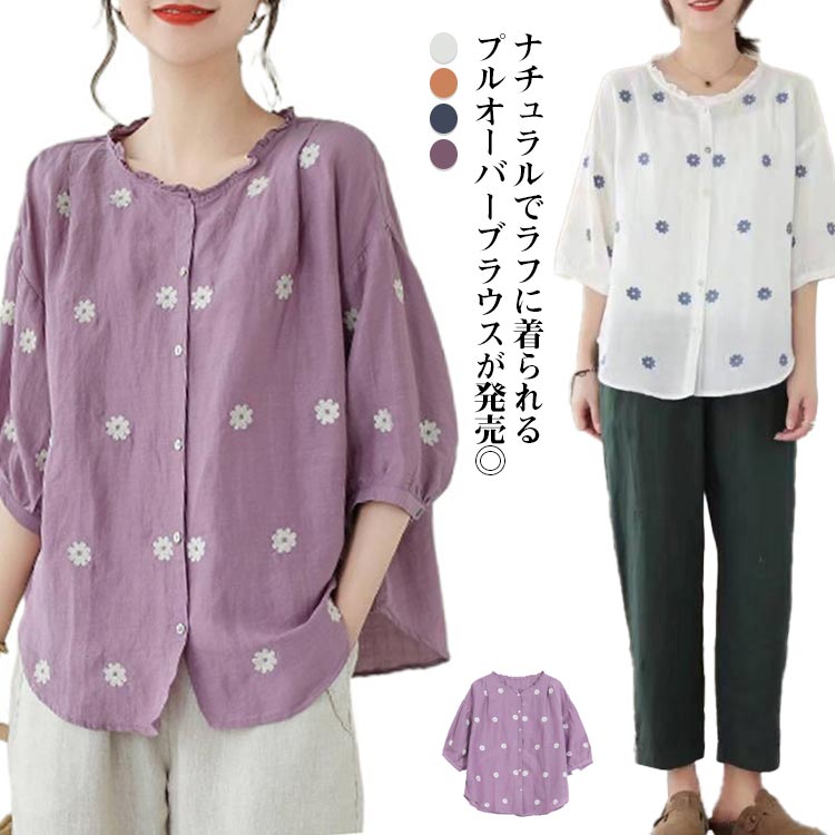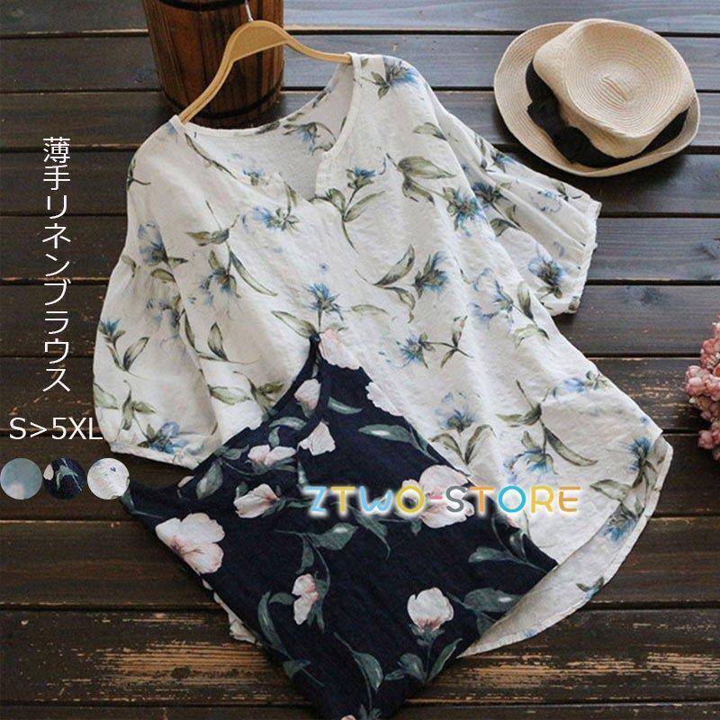 シャツ 麻 綿 レディース リネンシャツ シャツブラウス 花柄 半袖 トップス プルレディースファッション トップス シャツ ブラウス