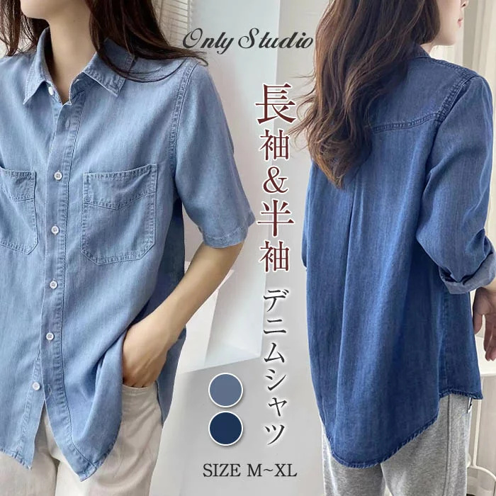 デニム シャツ ブラウス シャツ シャツブラウス トップス 無地 レディース 2タイプ 長袖 半袖 体型カバー ゆったり 前開き 羽織り カーディガン カジュアル 夏 秋