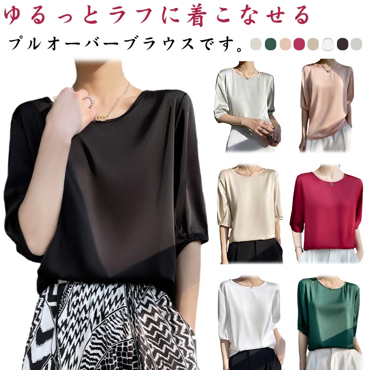 オフィス 五分袖 レディース プルオーバー サテン シャツ クルーネックレディースファッション トップス シャツ ブラウス