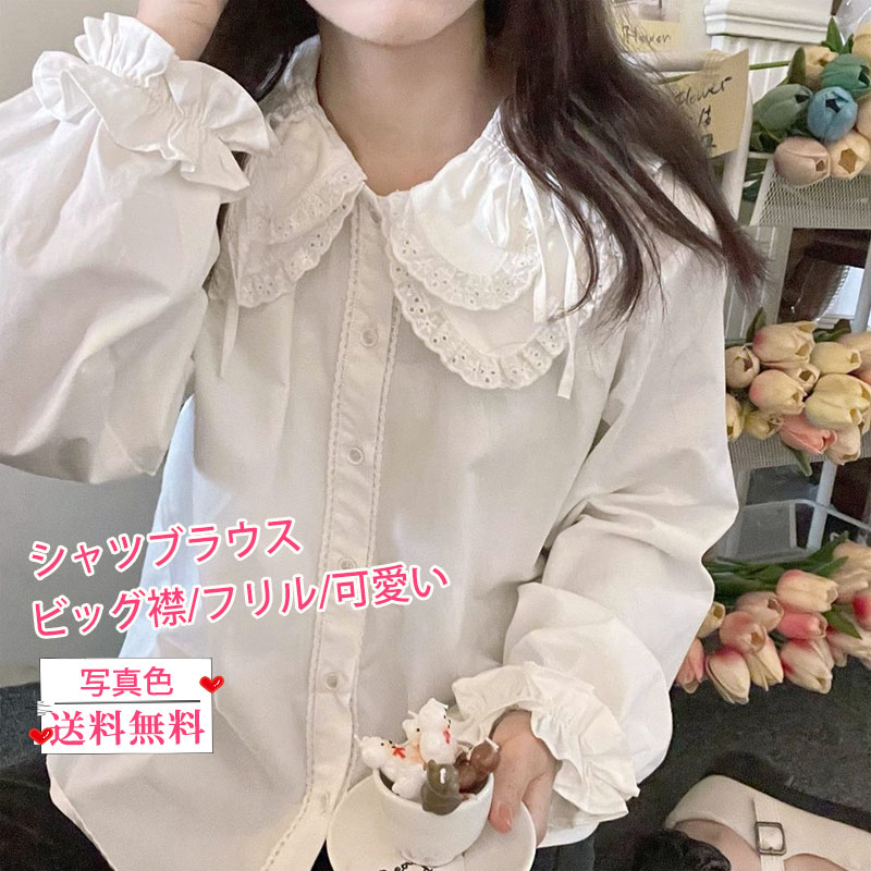 シャツブラウス ブラウス シャツ レディース フリルブラウス ビッグ襟 長袖 前開き トップス カジュアル ボタン付き リボン付き 着回し 可愛い 通勤 通学 春秋 おしゃれ