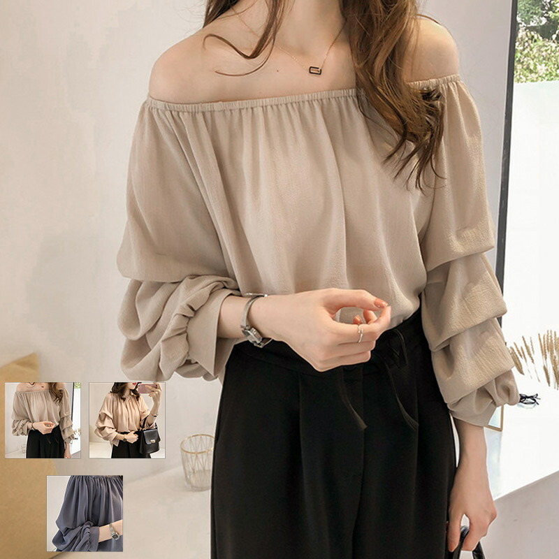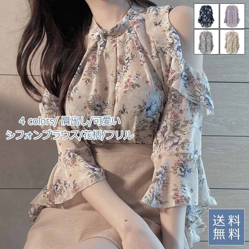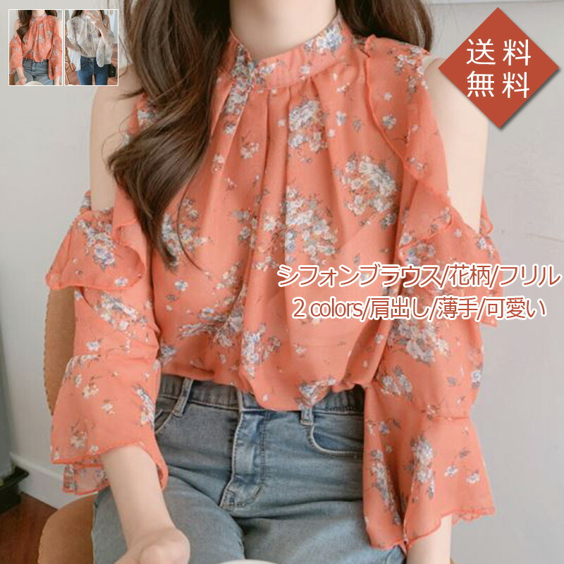 シフォンブラウス レディース ブラウス シャツ 花柄 クルーネック 長袖 フリル 肩出し トップス カジュアル 透かし 着痩せ 可愛い 女性用 きれいめ おしゃれ