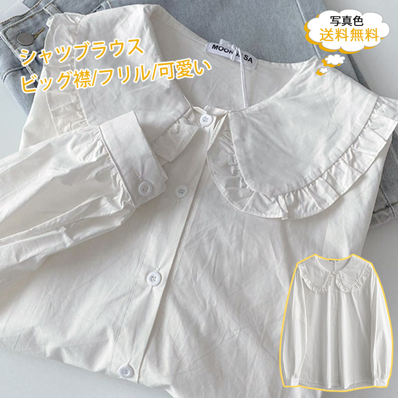 シャツブラウス ブラウス シャツ レディース 白シャツ 無地 ビッグ襟 長袖 前開き トップス カジュアル ボタン付き ボリューム 着回し 可愛い 通勤 通学 春秋 おしゃれ