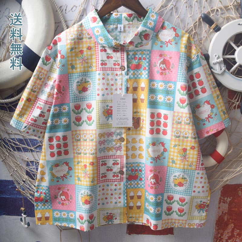 シャツ レディース ブラウス シャツブラウス トップス 半袖 ミドル丈 ラッフルカラー ガーリー 落書き 春 カジュアル 可愛い コーデ エレガント おしゃれ ファッション 体型カバー ゆったり 上品