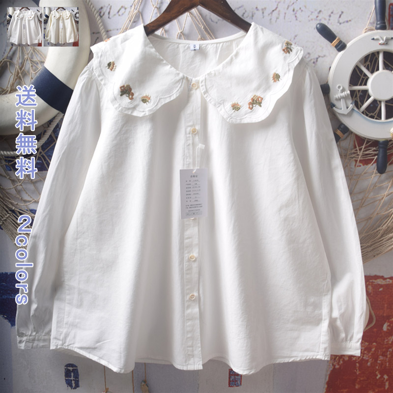 シャツ レディース ブラウス シャツブラウス トップス 長袖 ミドル丈 ラッフルカラー ガーリー 刺繍 春 カジュアル 可愛い コーデ エレガント おしゃれ ファッション 体型カバー ゆったり 上品