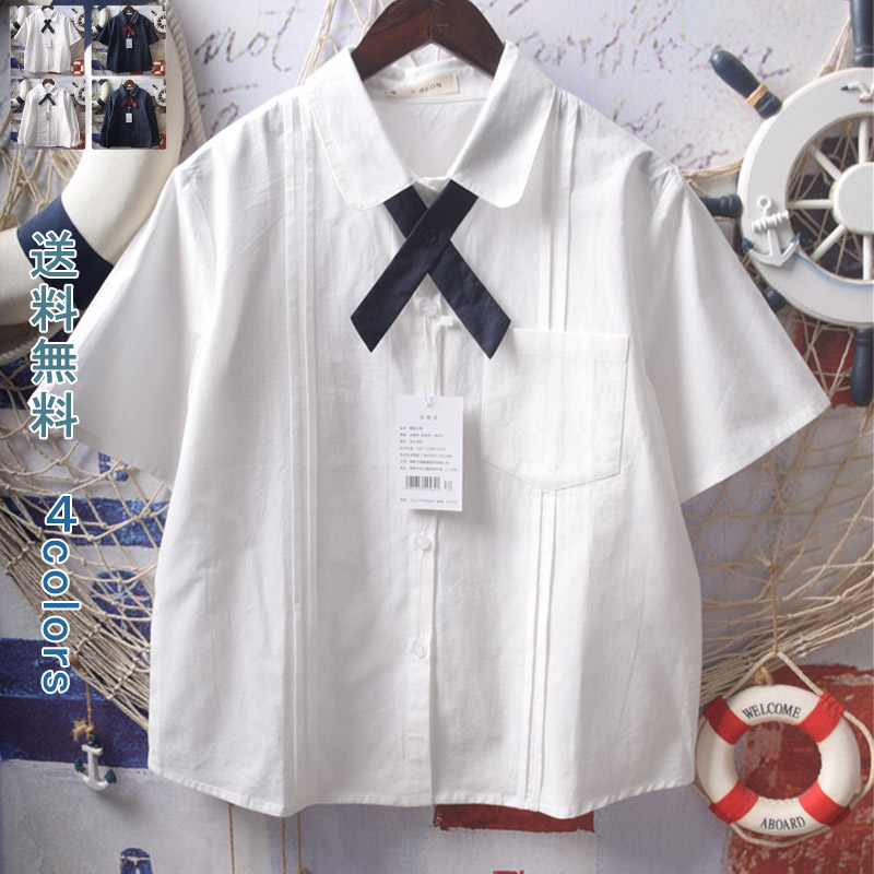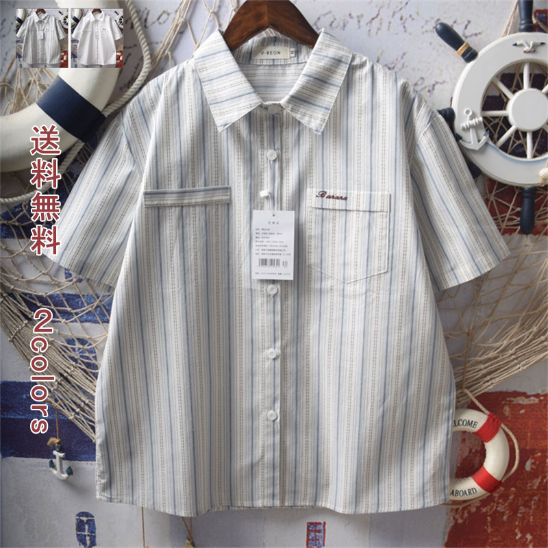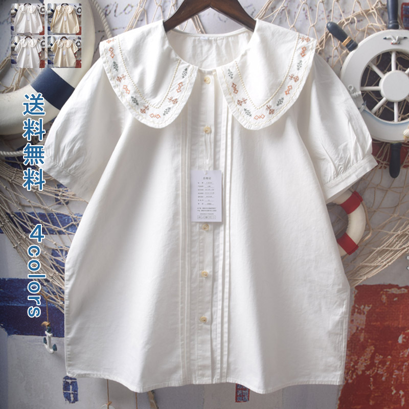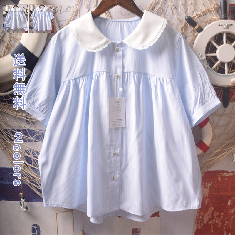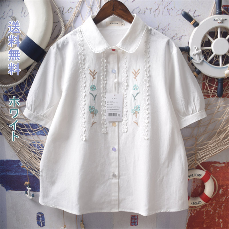 シャツ レディース ブラウス シャツブラウス トップス 半袖 ミドル丈 折り襟 ガーリー 無地 刺繍 ストライブ 春 カジュアル 可愛い コーデ エレガント おしゃれ ファッション 体型カバー ゆった