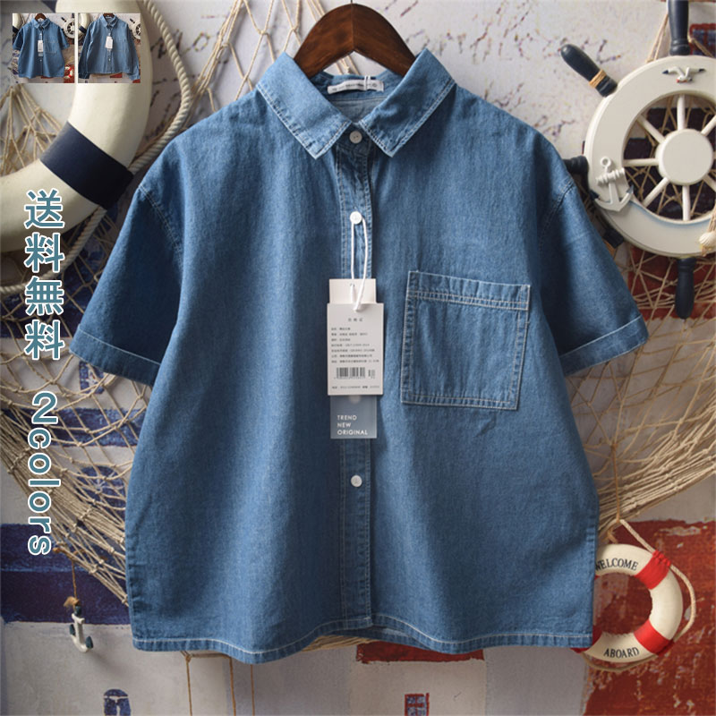 シャツ レディース ブラウス シャツブラウス トップス 半袖 ミドル丈 折り襟 ガーリー デニム 無地 春 カジュアル 可愛い コーデ エレガント おしゃれ ファッション 体型カバー ゆったり 上品