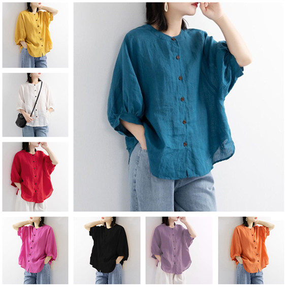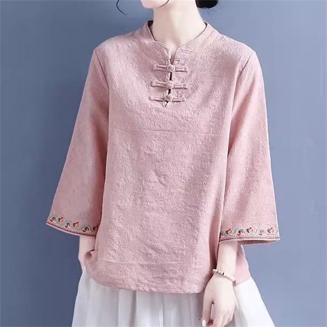 4色展開ブラウス シャツ レディース 半袖 トップス カジュアル 刺繍きれいめ おしゃれ かわいい 夏 大きめ 無地7分袖立て襟綿麻製 カジュアル フォーマル tシャツトップスレディーストップス