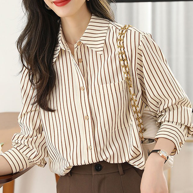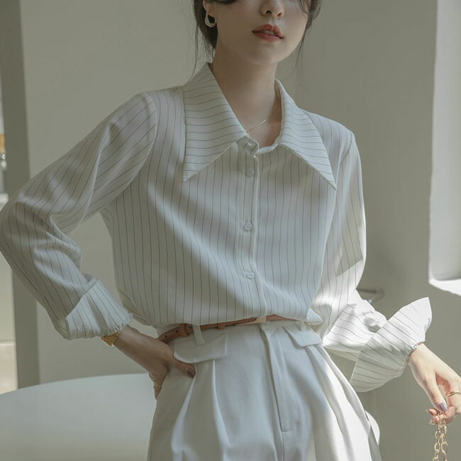 トップス レディース シャツ ブラウス 長袖 襟付き シフォン ストライプ 透け感 シースルー かわいい おしゃれ 大人 女子 こなれ感 ラフ キュート ルーズ カジュアル