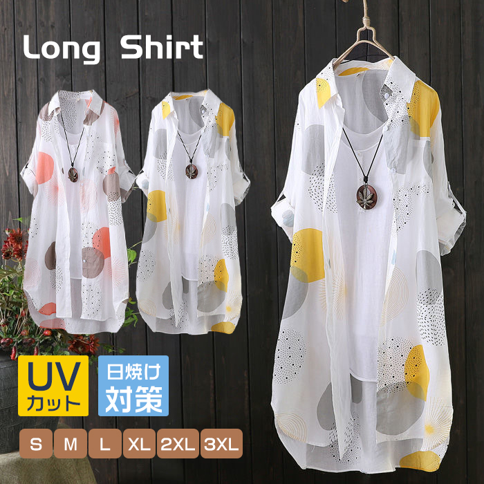シャツ レディース 夏 ロングシャツ カット シャツ 長袖 立ち襟 プリント柄 薄手 開襟 ゆったり 大きいサイズ 冷房対策 紫外線対策 きれいめ オフィス 長袖シャツ 対策