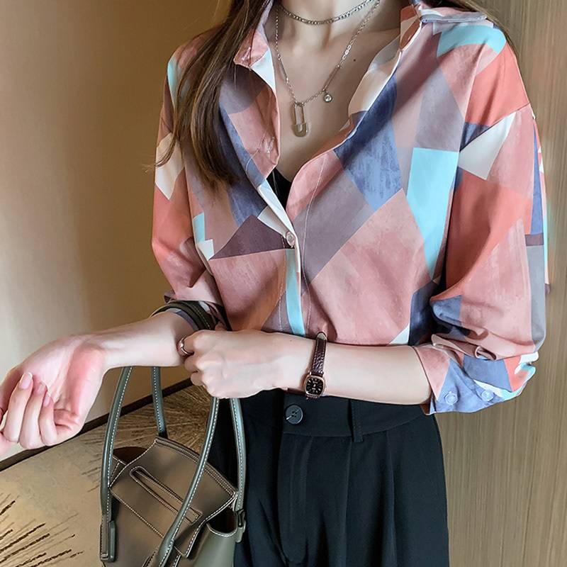ブラウス シャツ トップス レディース 個性的 長袖 春 柄 ピンク ブルー 2色展開 襟付き フロントボタン 前開き 休日 お出かけコーデ 普段使い 通勤 着回し ファッシ