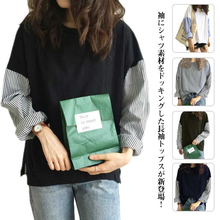異素材 プルオーバー ストライプスリーブ シャツ 無地 切り替え ホワイト ブレディースファッション トップス シャツ ブラウス