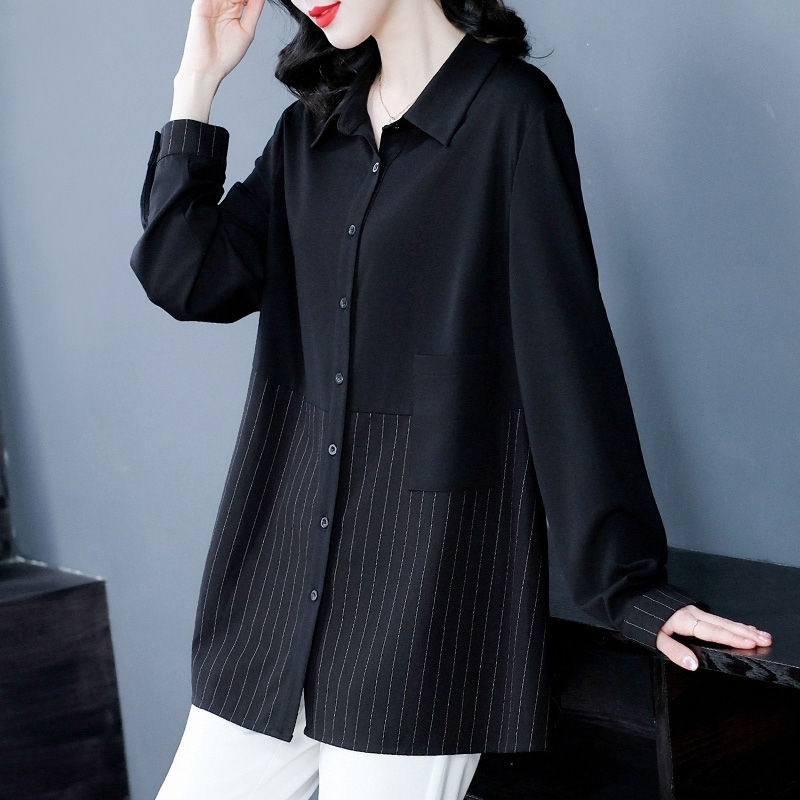 シャツ ブラウス トップス 切り替え ストライプ柄 レディース 長袖 開襟シャツ オーバーシャツ 大きいサイズ 襟付き オフィス OL ビジネス 通勤 着痩せ 春 秋 冬