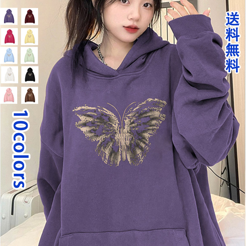 トレーナー スウェット おしゃれ バーカー ファッション 原宿風 フード付き 蝶 アウトドア レディース きれい 着やせ 20代 30代 40代 春 秋 冬 通勤 通学