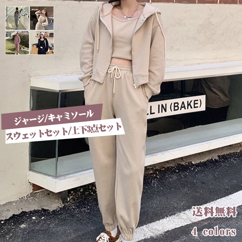 スウェットセット レディース スポーツウェア 無地 上下3点セット フード付き ジャージ キャミソール パンツ カジュアル 運動服 きれいめ おしゃれ