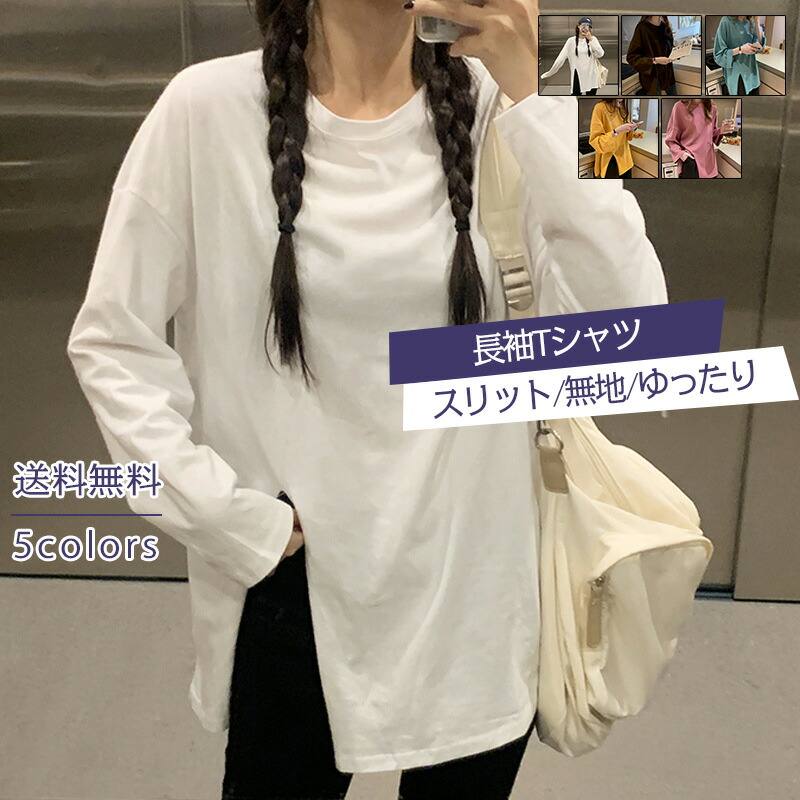 Tシャツ 長袖 レディース トレーナー 無地 クルーネック スリット ロング丈 体型カバー プショルダー トップス カジュアル 着痩せ 春秋 おしゃれ