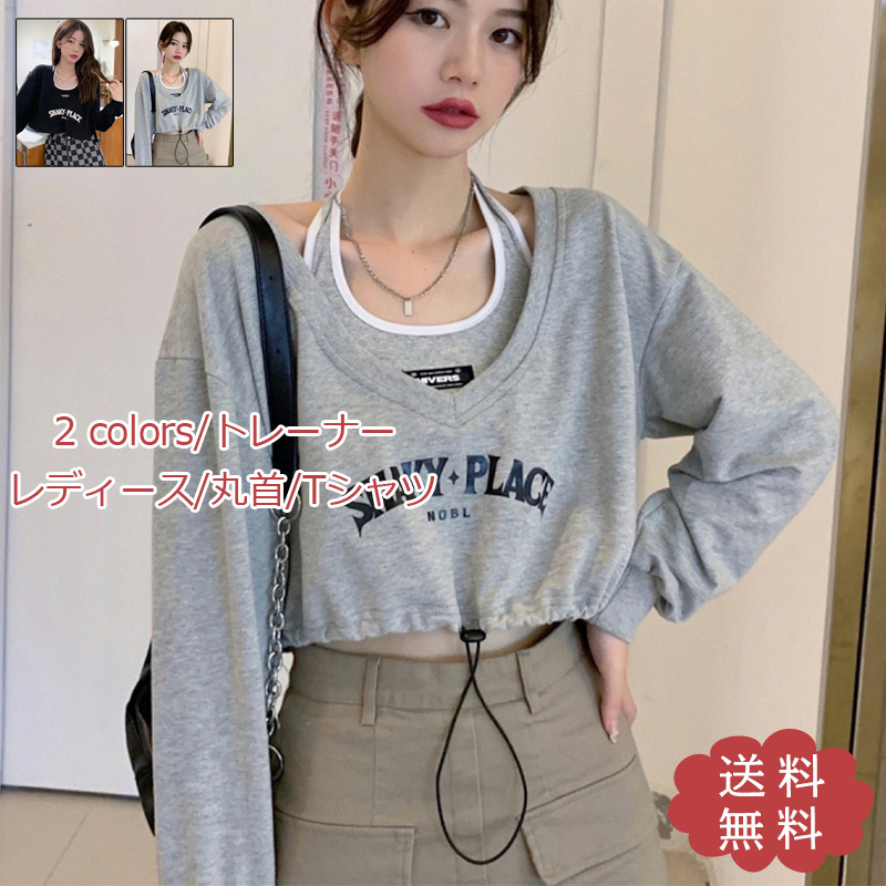 トレーナー レディース 2点セット Tシャツ キャミソール 長袖 丸首 ショート丈 トップス 柔らかい 薄手 きれい ファッション 個性的 春秋 おしゃれ