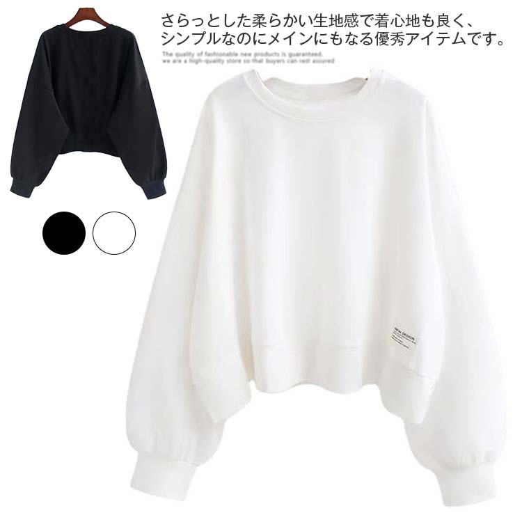プルオーバー レディース コットン混パーカー バルーンスリーブ トップス パーカー ゆったり トレーナー 無地 長袖 クルーネック ショート丈 韓国風 ホワイト ブラック 大きいサイズ