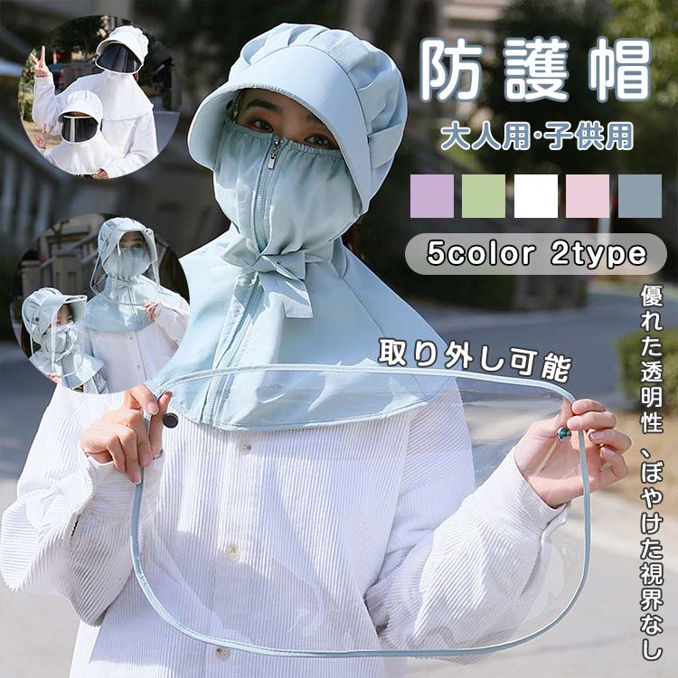親子ペアルック フェイスシールド付き 透明 防護帽 フェイスカバー 飛沫防止 紫外線対策 ハット 帽子 日焼け止め カット2 成人用 子供用 つば広ハット 安全 フェイスガード 取り外可