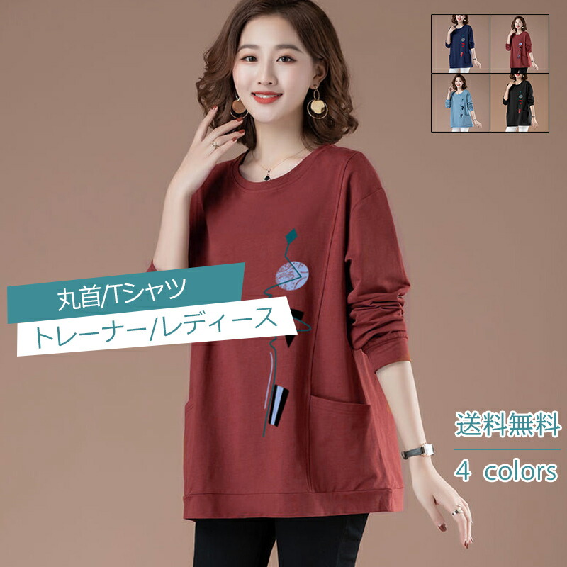 トレーナー レディース シャツ 丸首 長袖 ロング丈 中年 ポケット付き トップス キレイめ 大きいサイズ カジュアル ゆったり 春秋 秋新作 おしゃれ