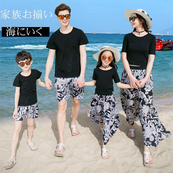 親子ペアルック ビーチ ワンピース 2点セット セットアップ Tシャツ 半袖 ハーフパンツ 男の子 女の子 父 母海旅行
