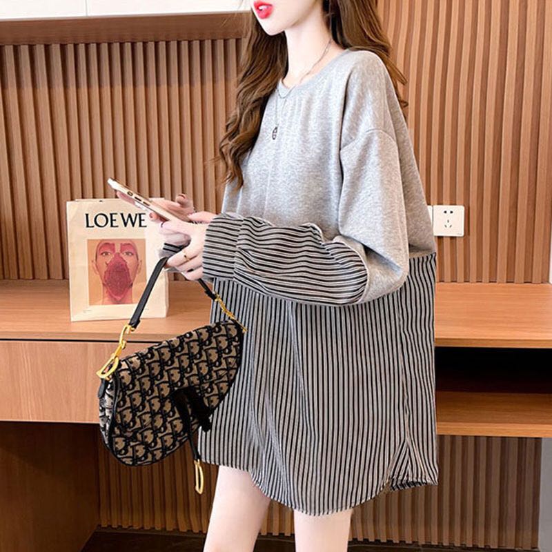 パーカー トレーナー レディース カジュアル 長袖 ストライプ柄 ドッキング 切り替えチュニック 切り替えトップス ドッキングトップス 春 薄手 おしゃれ 体型カバーゆったり バックリボン 重ね着風