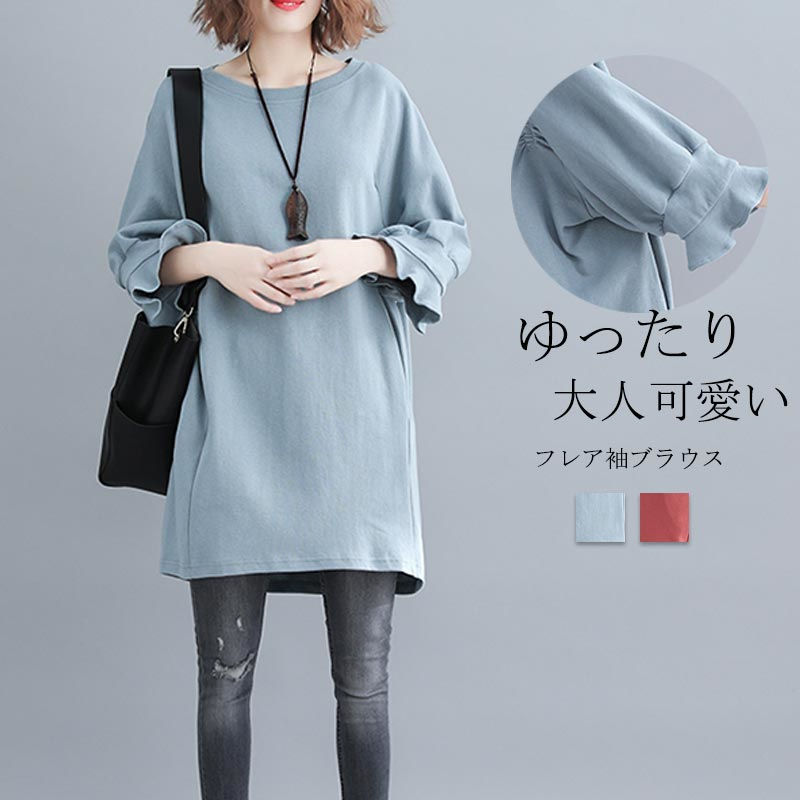 チュニック ブラウス 長袖 フリル tシャツ レディーストップス 春 大きいサイズ きれいめ ゆったり 無地 クールネック ストレッチ 40代 50代 30代