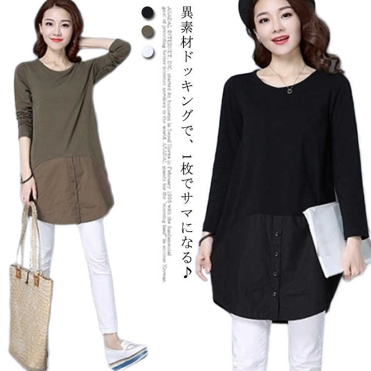 ワンピース 綿100% トップス シャツ カットソー 異素材 チュニック 切り替え 長袖 大きいサイズ ラウンドネック 体型カバー 着痩せ 春 秋 チュニック