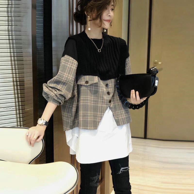 トップス チュニック 重ね着風 ニット 切り替えトップス 切替 レディーストップス 切り替えチェック カジュアル 春秋 レディース チェック柄 ゆったり チェック かわいい 可愛い おしゃれ お洒落