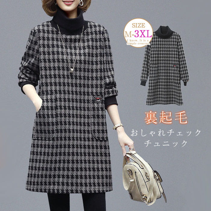 チュニック トップス チェック柄 裏起毛 ポケット付き タートルネック 配色レディースファッション チュニック