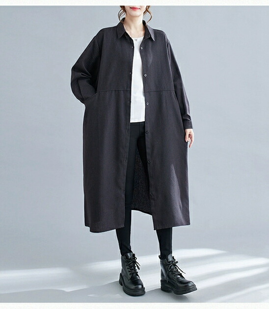 前開けも、前閉じでもきまるデザイン ロングシャツ ストライプ柄 シャツワンピース カットソー 秋 春 長袖 レディース