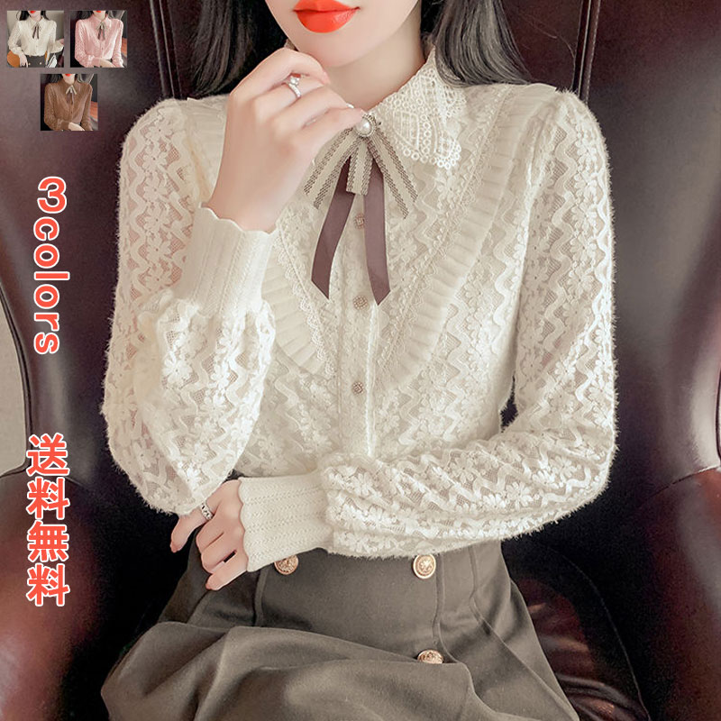 ブラウス レース ボア付き 裏ボア レディース トップス タートルネック ハイネック レース リボン 防寒 暖かい ゆったり 大きめ トップス ボーダー キレイめ 上品 シンプル ベーシック 部屋着