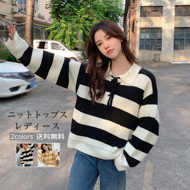ニットセーター レディース トップス ニット セーター ネック ポロシャツ 横縞 柄 キレイめ きれいめ 長袖 ゆったり 大人 セーター 襟 長袖ニット 長袖ニットプルオーバー フリーサイズ 長袖ニ