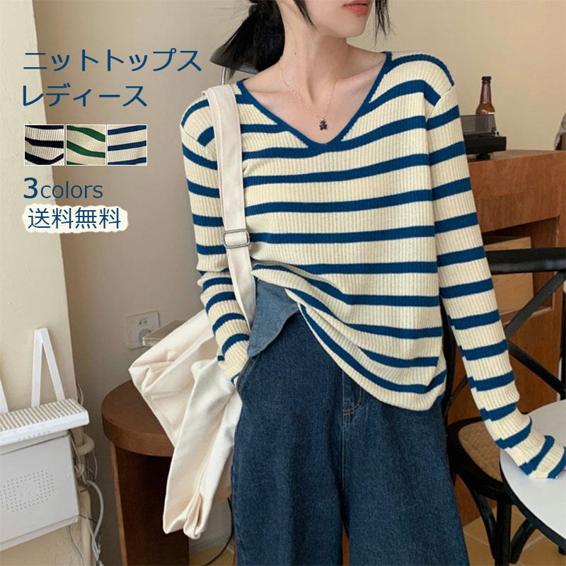 ニットトップス レディース ニット 横縞 柄 Vネック キレイめ きれいめ 長袖 ゆったり 大人 セーター 襟 長袖ニット 長袖ニットプルオーバー フリーサイズ 長袖ニットセーター オシャレ シンプル