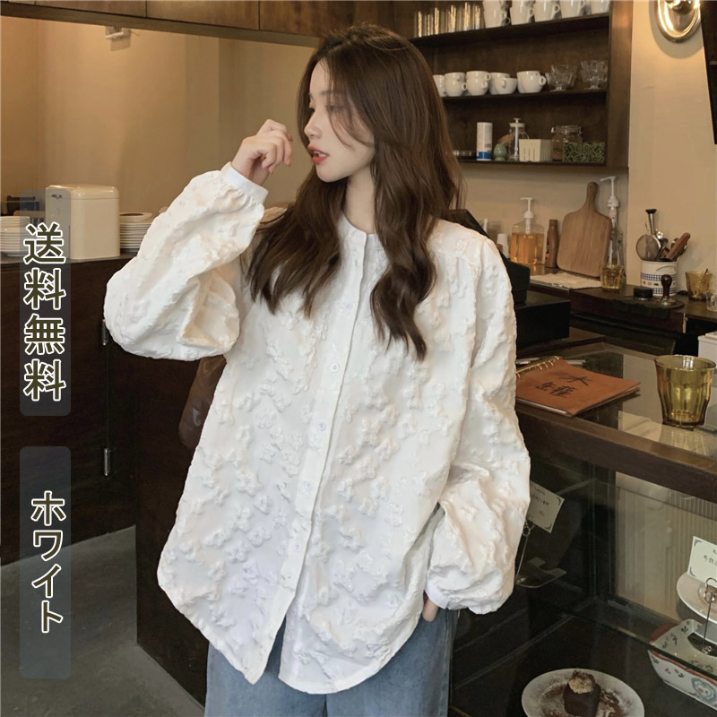 シャツ ブラウス トップス レディース シャツブラウス ミドル丈 フリル 長袖 ブルーム袖 レース ホワイト 春 無地 シンプル カジュアル コーデ エレガント おしゃれ 通勤 上品 ゆったり 大人