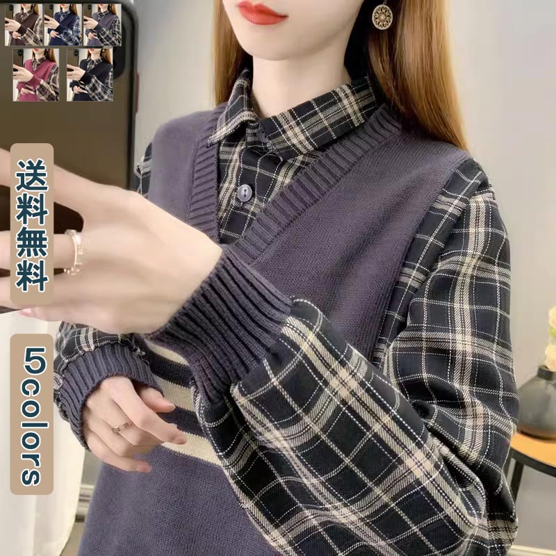 偽2点セット ニットベスト シャツ チェック柄 レディース トップス 切替 ユニセックス シンプル 人気 ケーブルニット Vネック 可愛い ファッション カジュアル きれいめ おしゃれ 秋冬 学生服