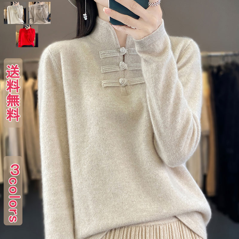ニットセーター チャイナ風 レディース トップス インナー ハイネック タートルネック 無地 中華風 セーター デザイン 胸元 ボタン 長袖 大人 ファッション 暖か 防寒 オフィス カジュアル おし