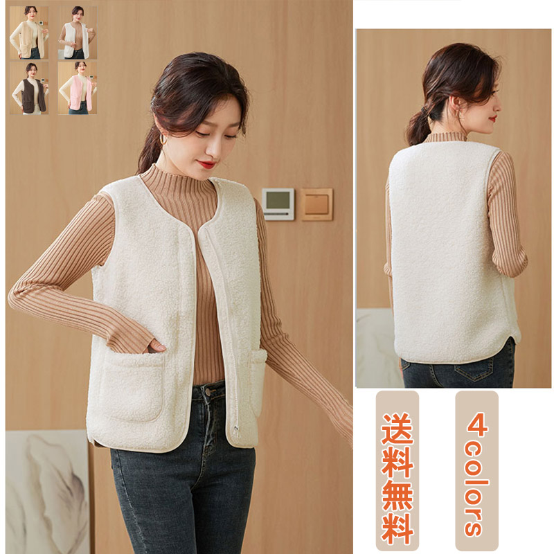 ボアベスト レディース ノーカラー 秋冬 ショートベスト もこもこ フリースベスト ムートン ベスト もこもこ アウター ボアコート ロング トップス ファーコート 前開き 丸首 無地 部屋着 防寒