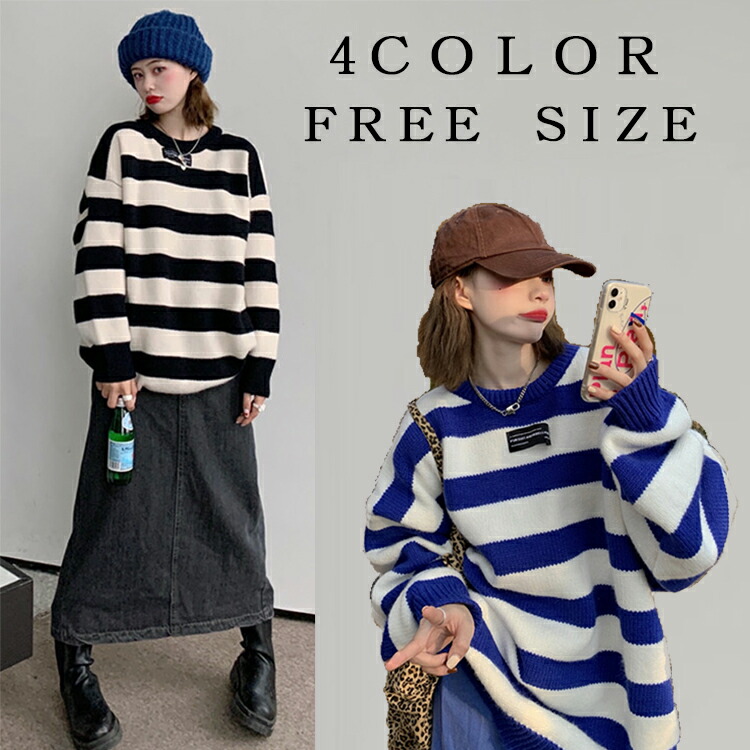 ☆2点目300円OFFクーポン☆4カラー ボーダーニットトップス ローゲージニット クルーネック 太ボーダー リブ ブラック ホワイト ブルー イエロー ピンク レディース トップス