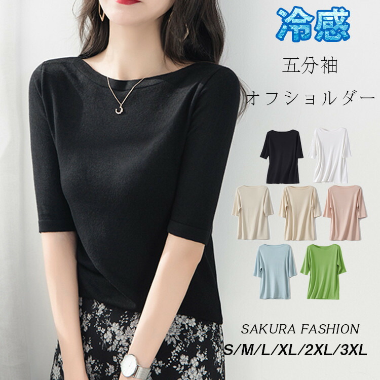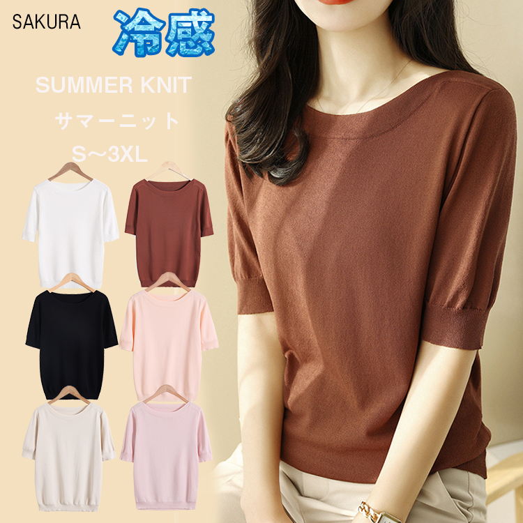 サマーニット 春 夏 五分袖 5分袖 半袖 レディース プルオーバー ボートネック ライトニット トップス カットソー ニット着痩せ 細見え オフィスカジュアル デイリー トップス ニット 接触冷感