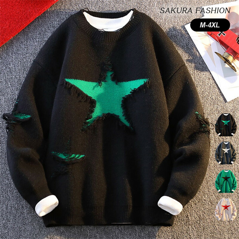 ニット ホシ柄 レディース メンズ ユニセックス トップス セーター ニットウェア 長袖 クルーネック 大きいサイズ ゆったり 春 配色×ダメージ プルオーバー