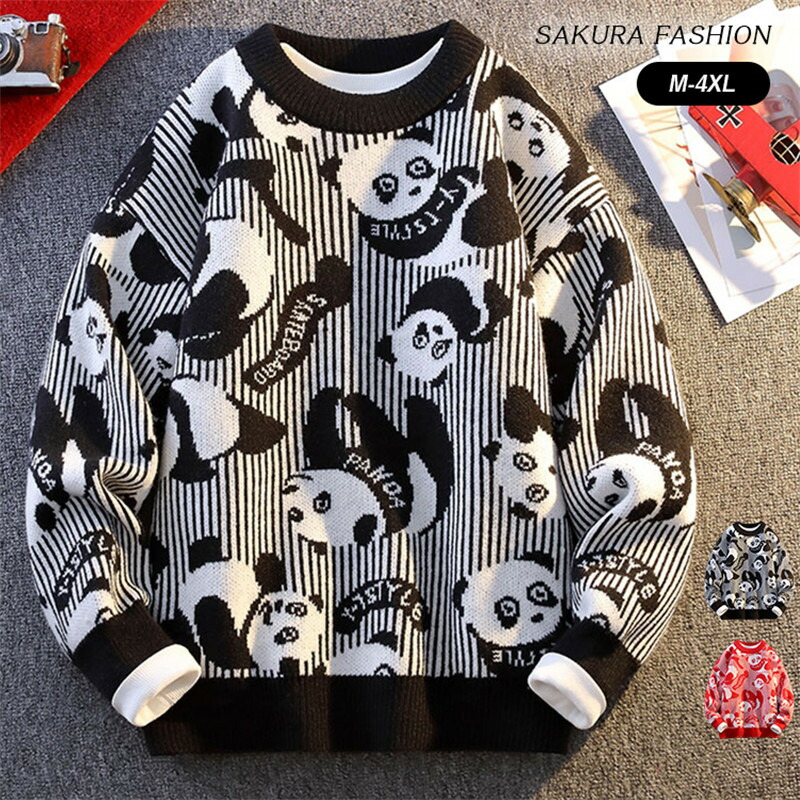 ニット ストライプ 柄 レディース メンズ ユニセックス トップス セーター ニットウエア ニットウェア 長袖 長そで 丸首 大きいサイズ ゆったり 秋 パンダー柄ニット プルオーバー