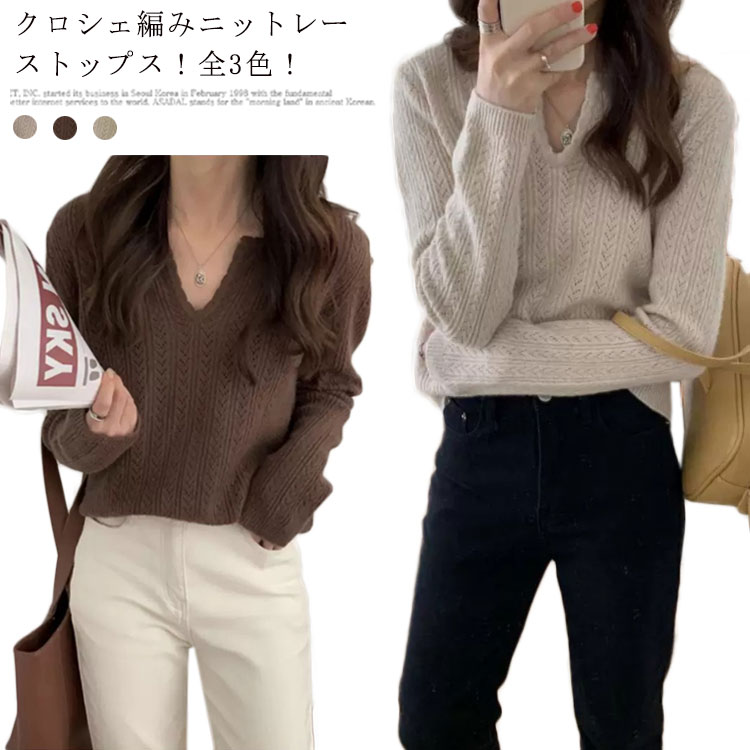 ニット レディース トップス 透かし編み 長袖 可愛い 長袖ニット 上着 春 秋 大人 上品 きれいめ 韓国 ファッション ホワイト グリーン vネックニット