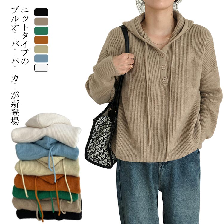 ニットパーカー レディース プルオーバーパーカー 長袖 ルーズ ゆったり 着痩せ かわいい 通勤 シンプル 普段着 秋新作 無地ニット ニットセーター