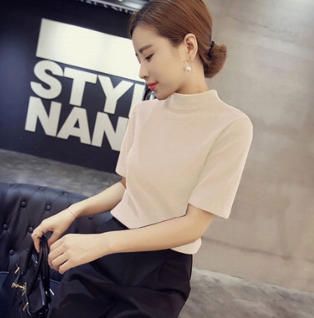 レディーストップス5分袖カットソーニットサマーセーター無地ハイネックカジュアルキュート大人可愛いベージュブルーイエローネイビーグリーン